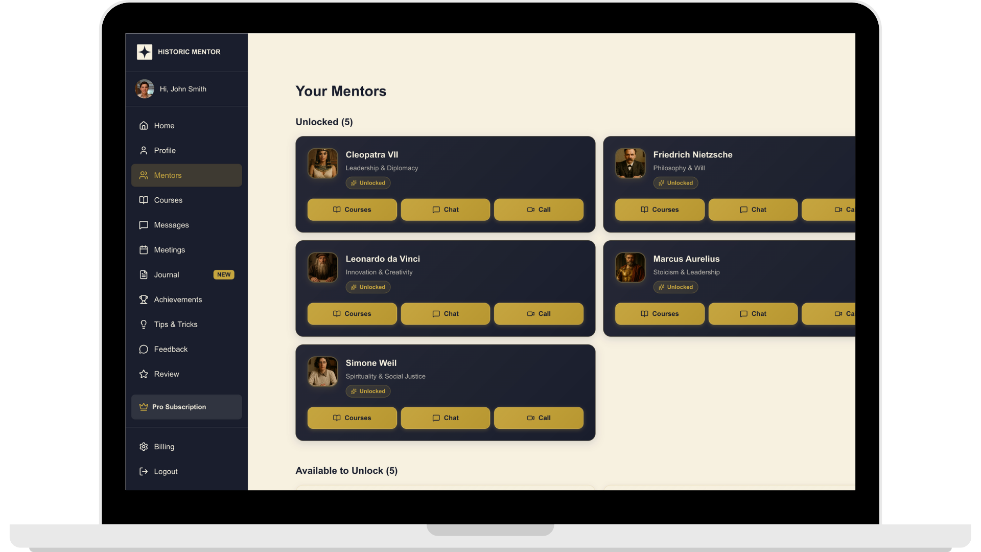 Historic Mentor offers live video-based, personalized “facetime” mentorship with AI-generated conversational avatars of Marcus Aurelius, Cleopatra, Sun Tzu, Benjamin Franklin, Leonardo da Vinci, Simone Weil, Socrates, Lao Tzu, Confucius, and Friedrich Nietzsche (depending on your plan, you may have access to 5 mentors of your choice – or all current + future active mentors). Users are able to login to their dashboard and immediately start a call with the mentor of their choice. Each mentor keeps track of every conversation and references your profile’s bio in real time, allowing them to provide personalized advice and tailor their insights to your needs. After you end the call or the time limit is reached, your session transcript and details are saved to your meetings dashboard for future reference. All members receive a new daily journal prompt with thought-provoking questions to encourage self awareness and growth, along with a journal entry dashboard to view all previous entries or missed prompts. Historic Mentors also reference these journal entries to provide contextual advice and insights personalized to your life and priorities. Members also have access to premium digital courses featuring video lectures, audio recordings, downloadable content, and additional journal prompts.