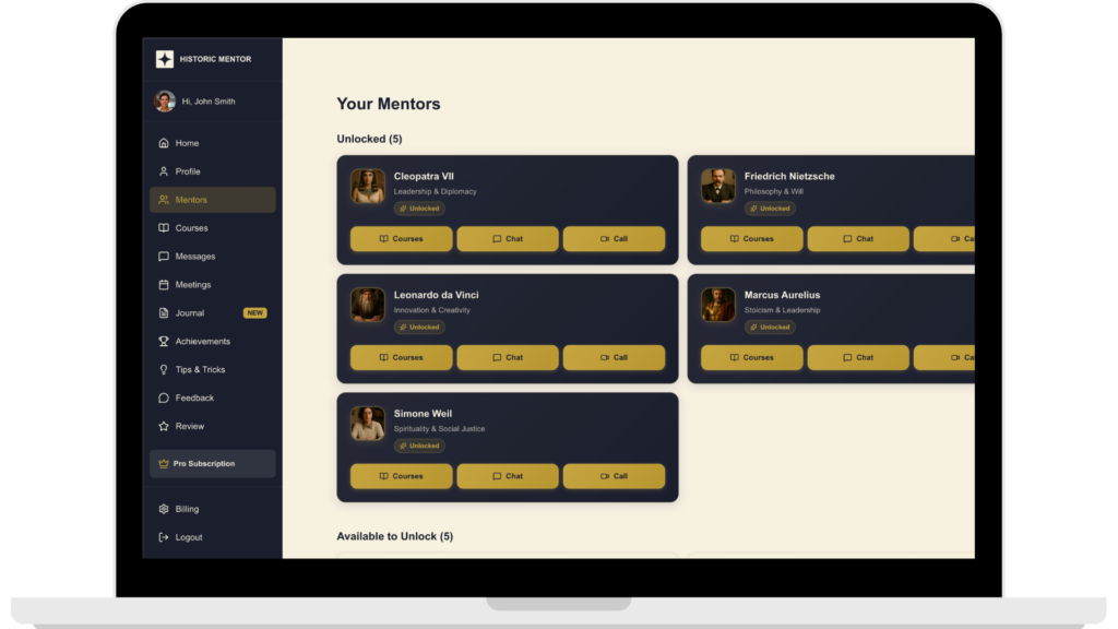 Historic Mentor currently offers live audio-based mentorship sessions with AI-generated avatars of Marcus Aurelius, Cleopatra, Sun Tzu, Benjamin Franklin, Leonardo da Vinci, Simone Weil, Socrates, Lao Tzu, Confucius, and Friedrich Nietzsche. Users are able to login to their dashboard and immediately start a call with the mentor of their choice. Each mentor keeps track of every conversation and references your profile’s bio in real time, allowing them to provide personalized advice and tailor their insights to your needs. After you end the call or the time limit is reached, your mentor will email you a conversation summary and full transcript. You are also able to view all past call summaries in your member dashboard.